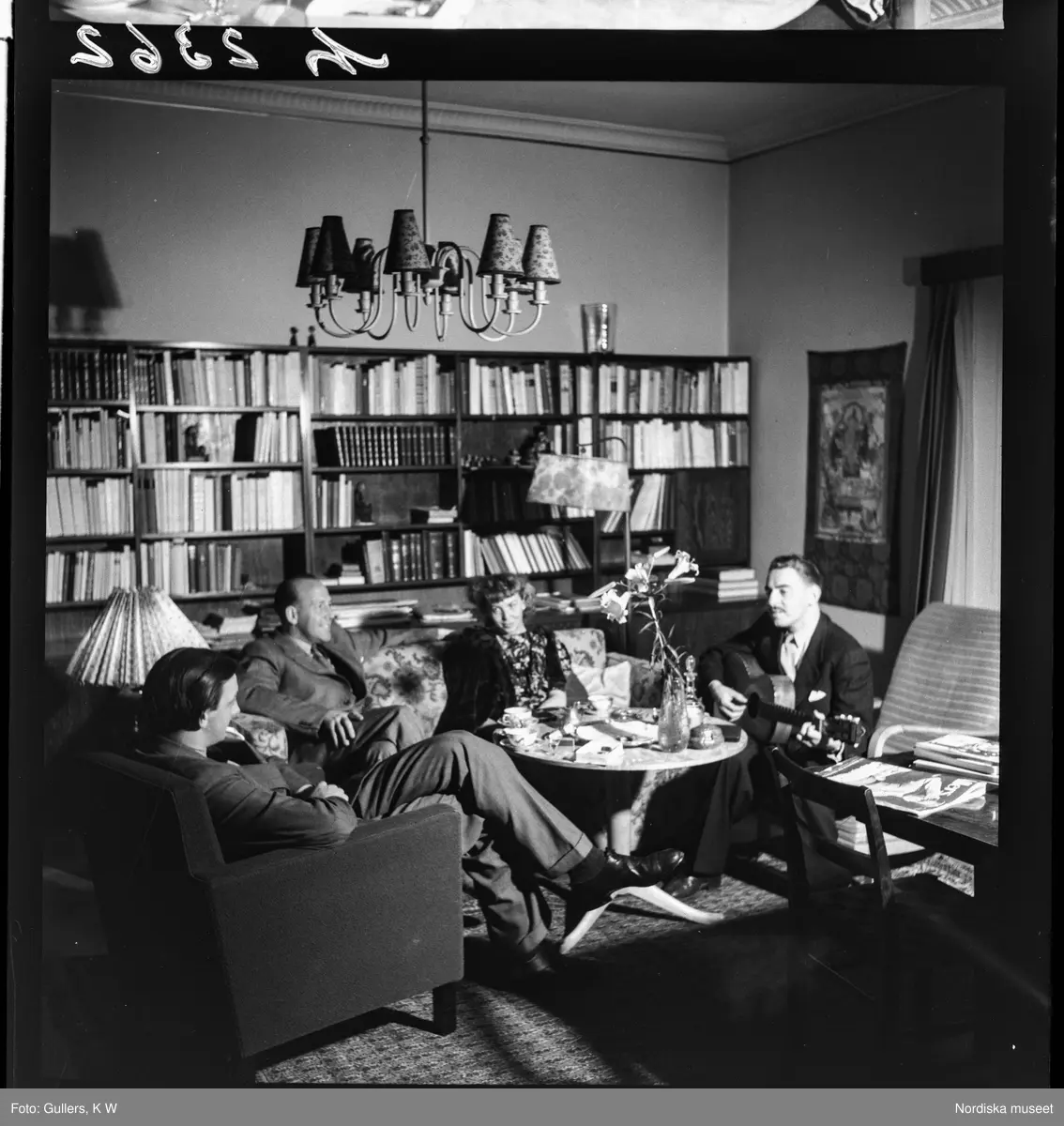 513 A Runar Karslströmer Hemmiljö. Ett sällskap umgås och musicerar tillsammans. Runar Karlströmer på gitarr.