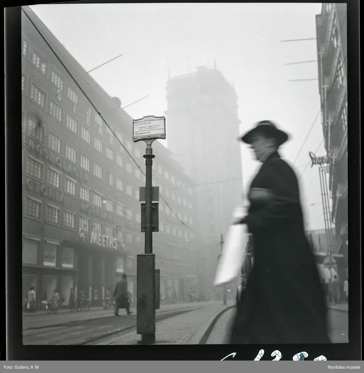 542 Dimma. En kvinna vid en hållsplats på Kungsgatan.