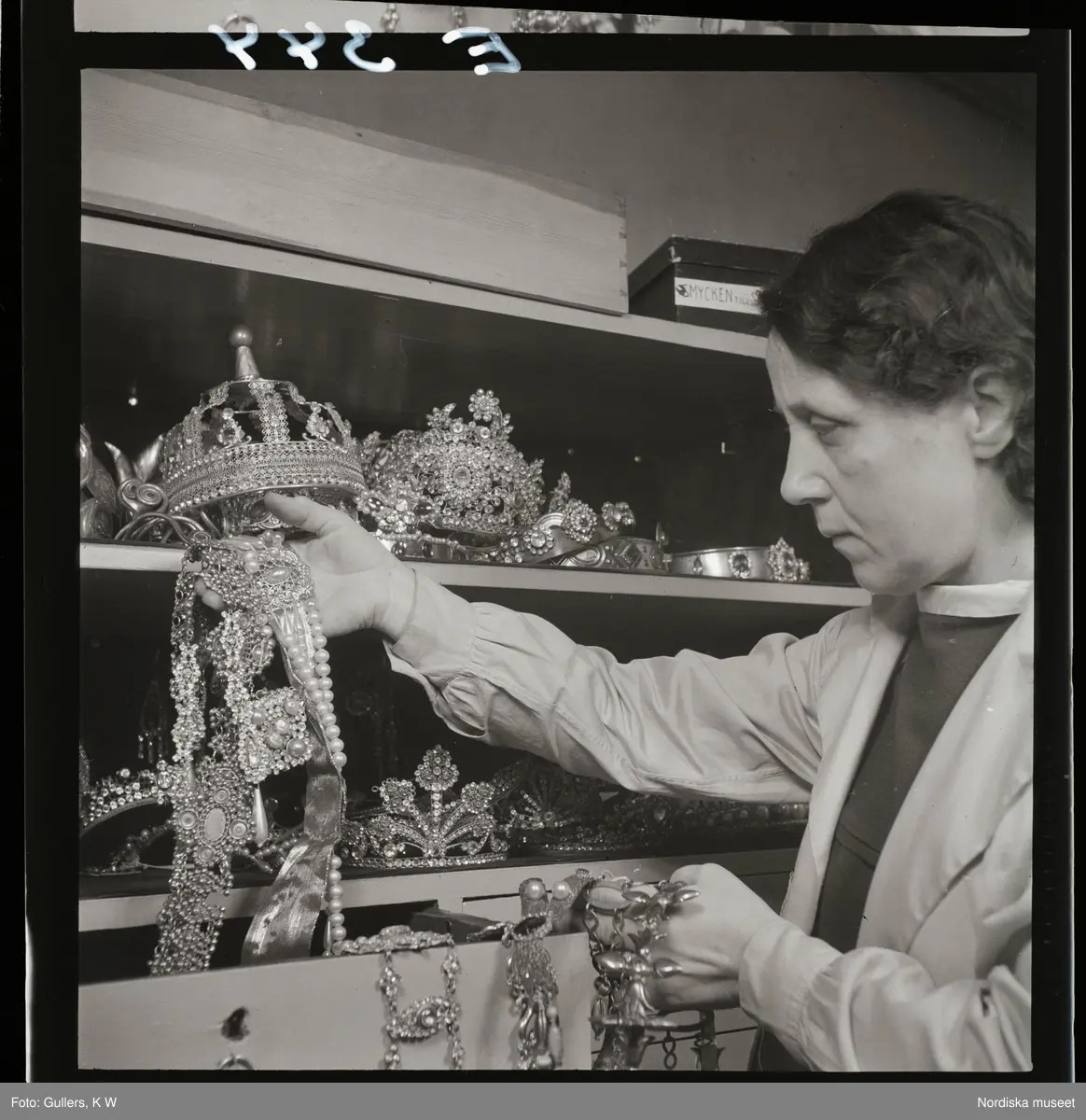 561 Operan för Allers. En kvinnlig arbetare visar accessoarer i ett skåp.