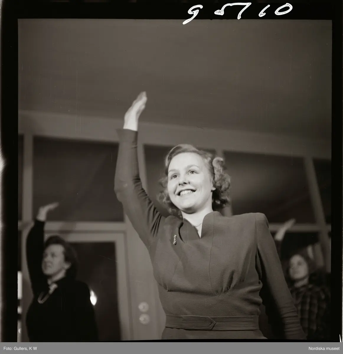 599 G, Åtvidabergs Industrier kontorsgymnastik. Tre kvinnor gymnastiserar på ett kontor.