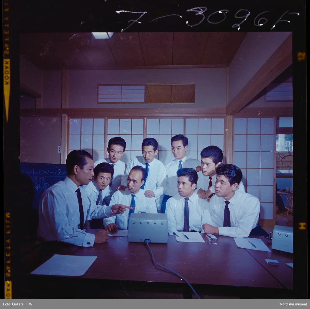 585/8 Facit Tokyo Daberg. En grupp män samlade runt en Facit maskin.