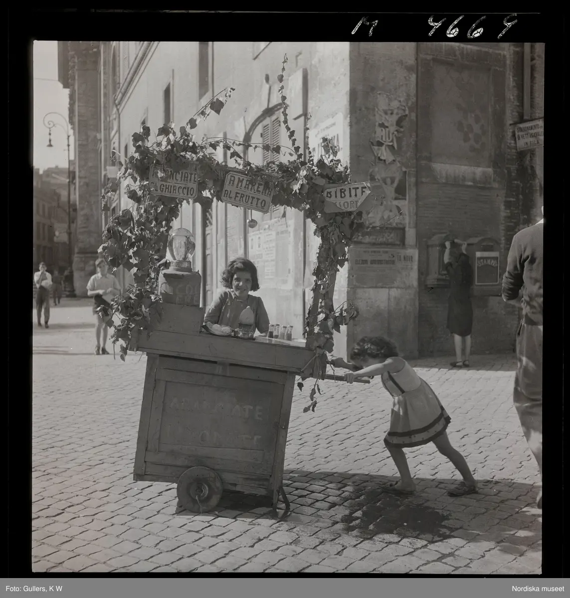 1717/B Rom. Två flickor säljer drycker från ett litet ambulerande lemonad-stånd.