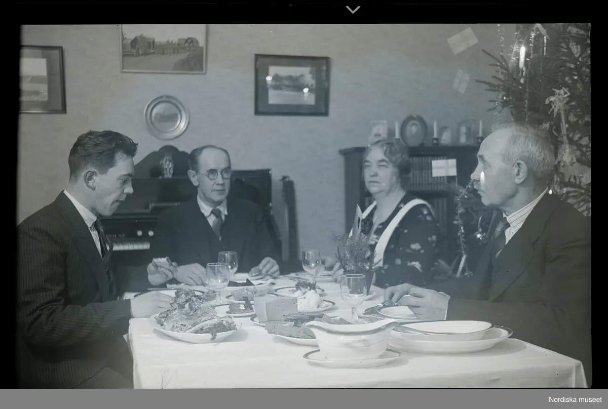 Ett sällskap äter middag vid ett dukat bord, juletid.