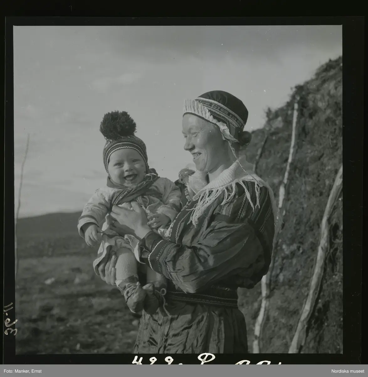 En kvinna bärandes ett glatt litet barn, porträtterade utanför en torvkåta.