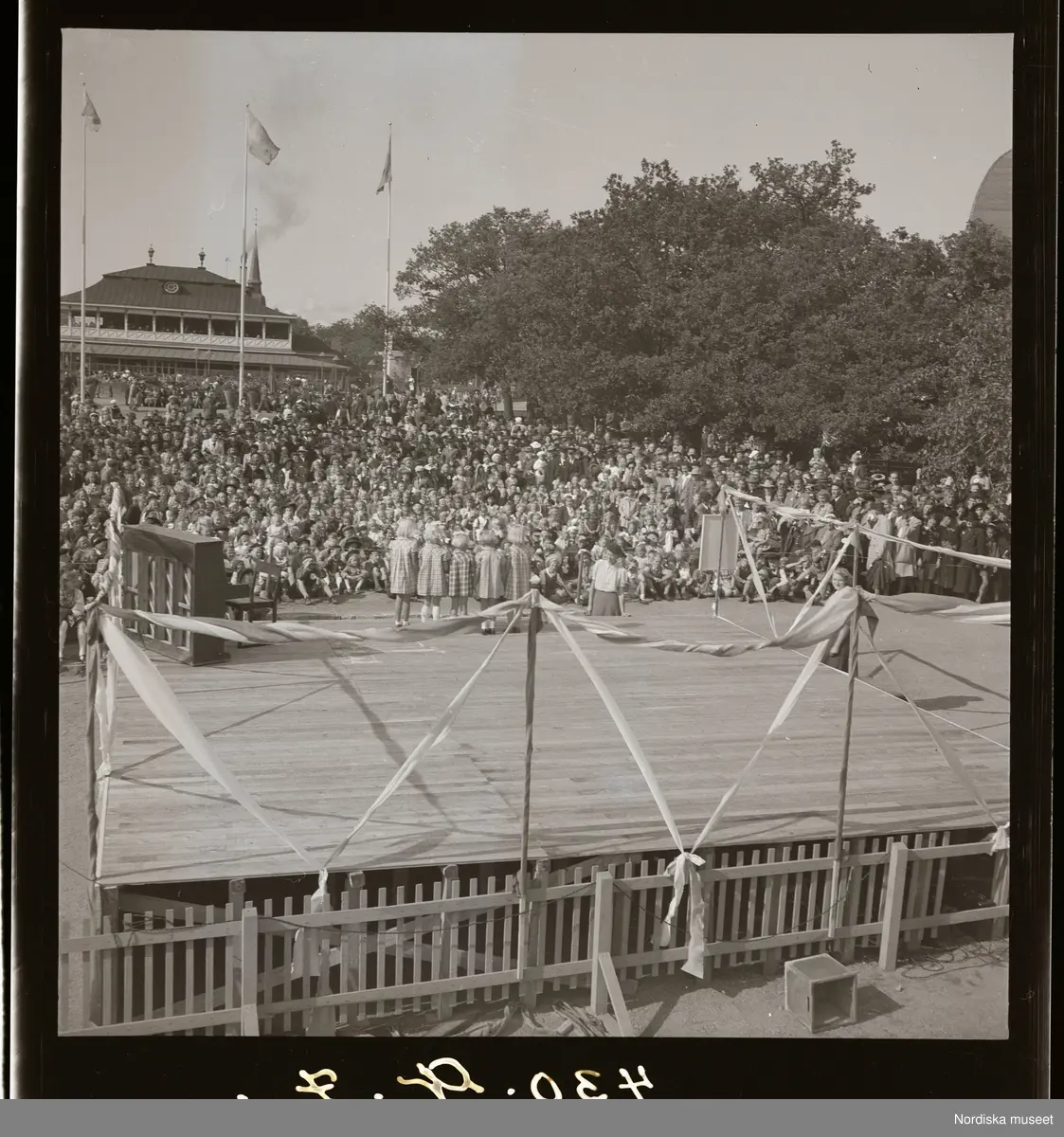 Publik framför scen med fem flickor. Skansen, Stockholm.