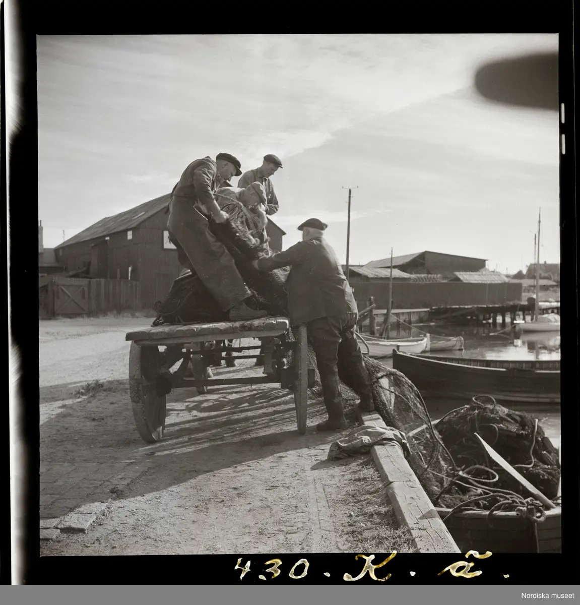 Text på montering i arkivet: Bottengarnen halas av laget från båten upp på bonden Ingels vagn och köras till torkplatsen vid Åkroken.