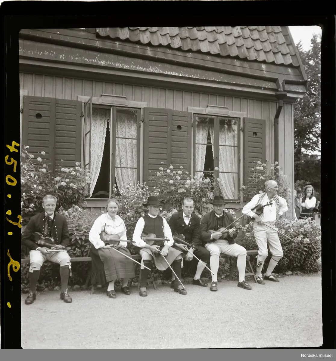 Folkmusiker sitter och vilar under en paus. Skansen, Stockholm. Skansen, Stockholm.