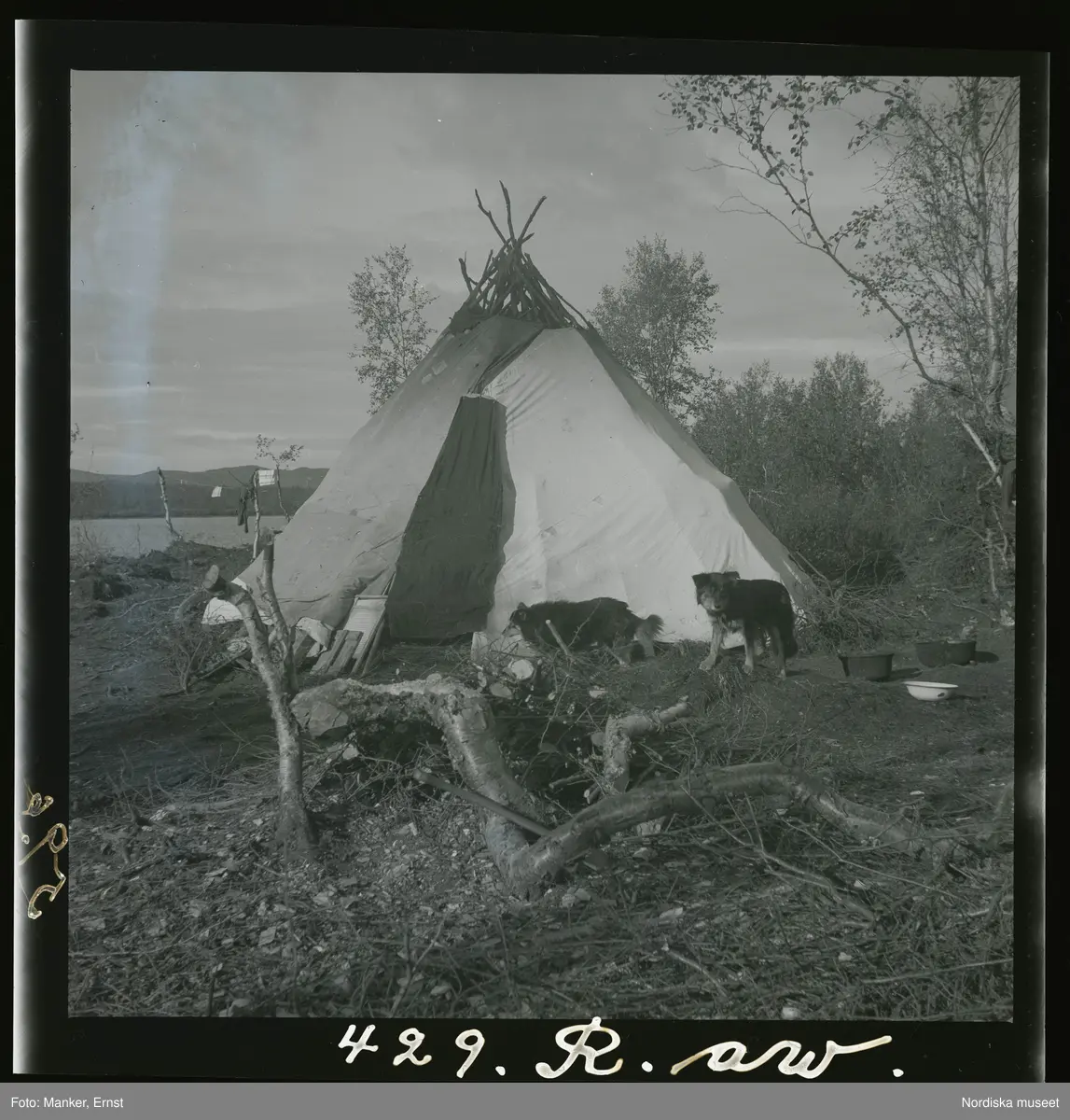 Ett par hundar framför en tältkåta.