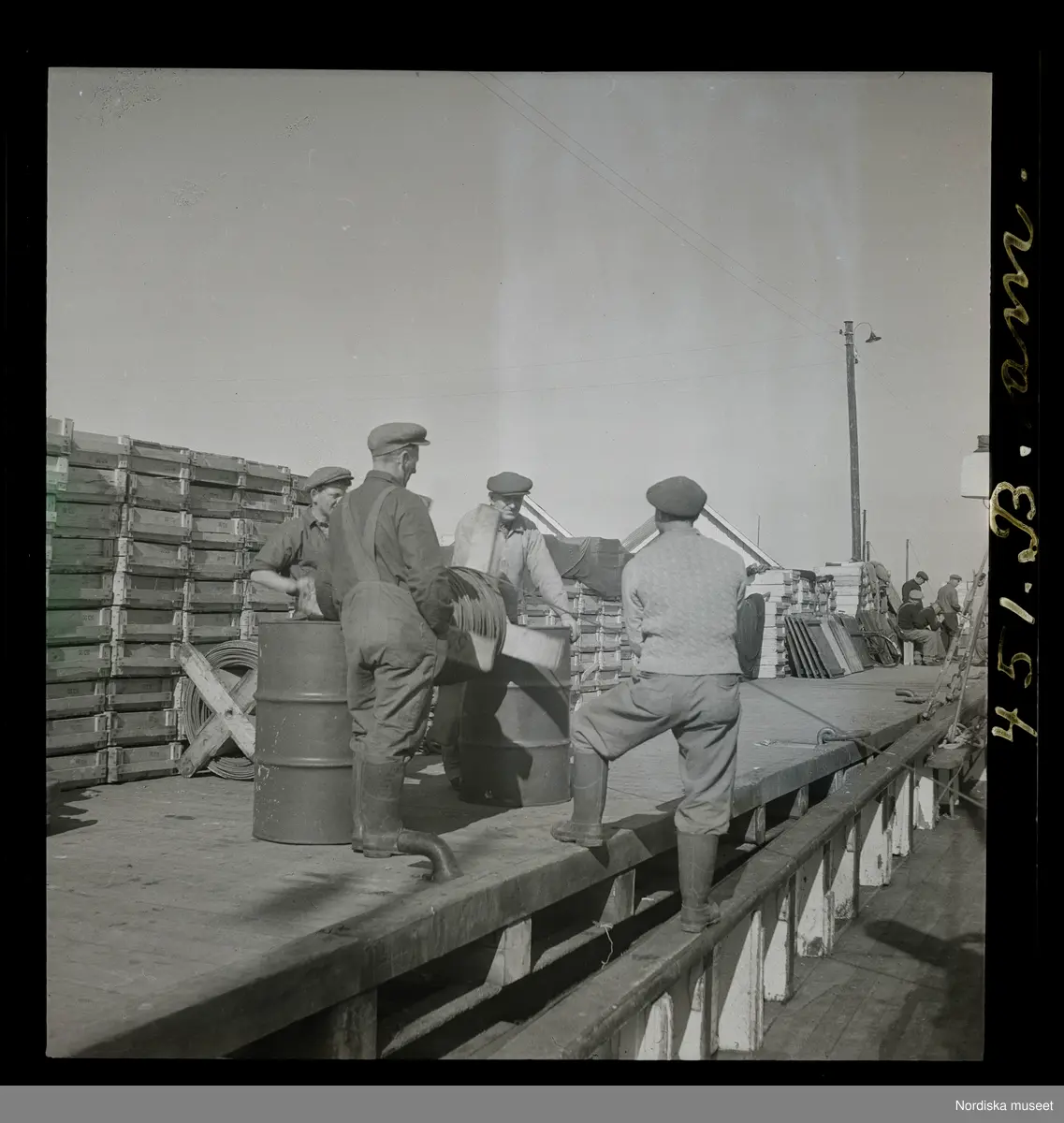 GG 126 Lilly av Vrångö skall utrustas med nytt spel och vajern tas i land. Fr.v. Sture Kristensson, Oskar Cambrén, Artur Andersson, alla från Vrångö, samt Himler från Kyrksund.