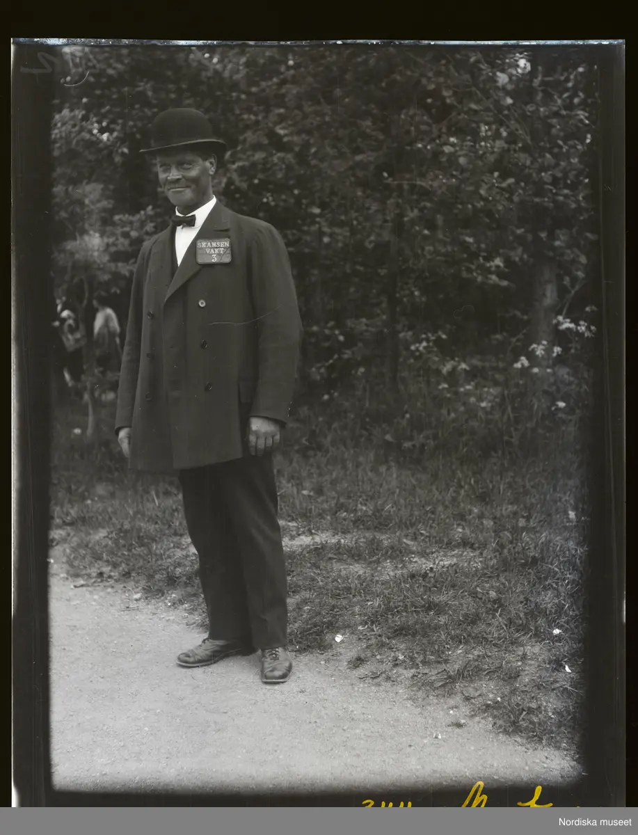 Porträtt av man med skylt på kavajslaget: "Skansen vakt 3"