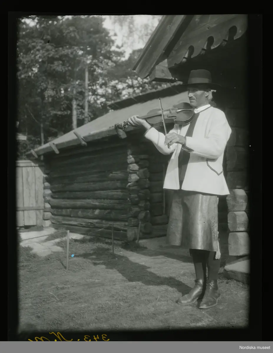 Man i folkdräkt spelar fiol. Skansen, Stockholm.