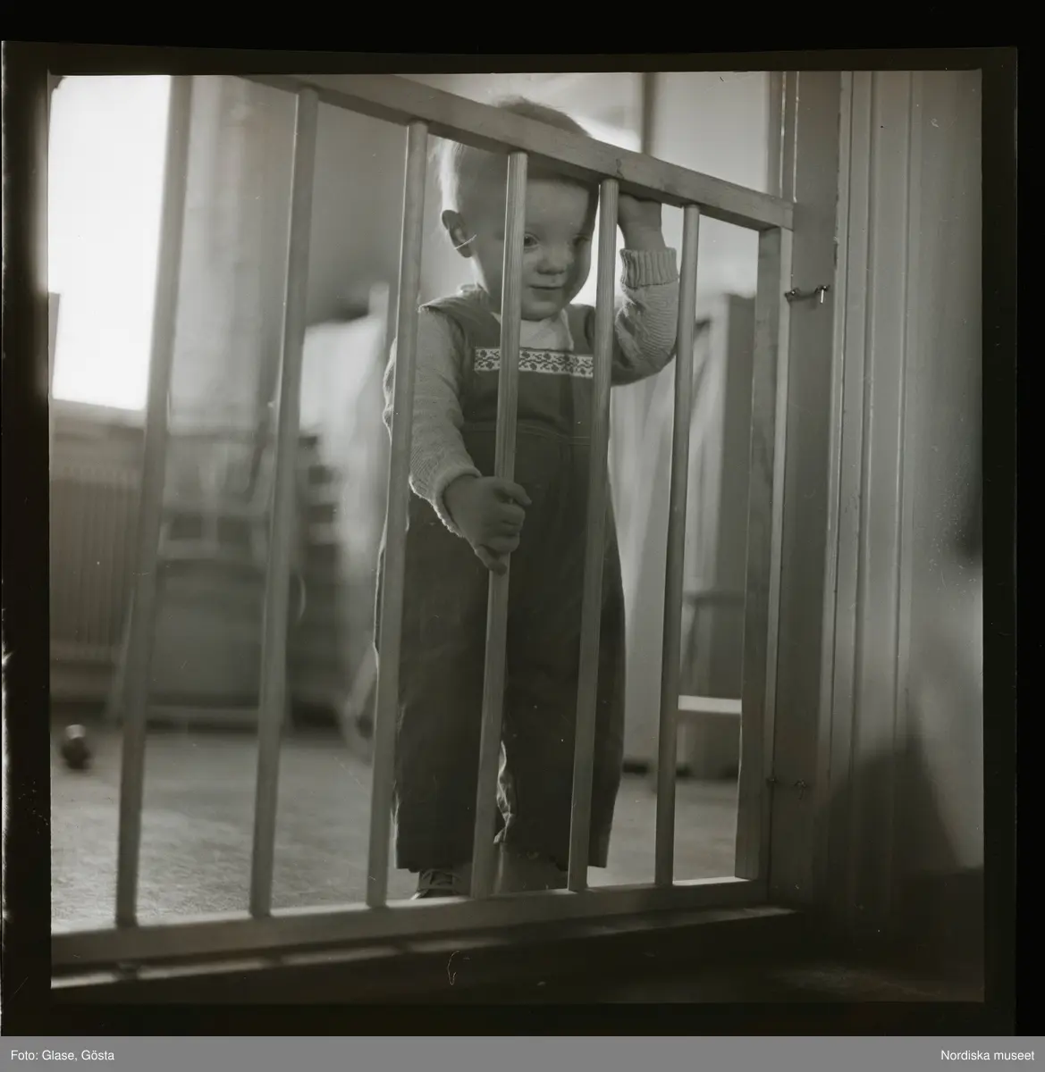 Ett litet barn står vid en grind uppsatt i dörröppningen till ett rum.