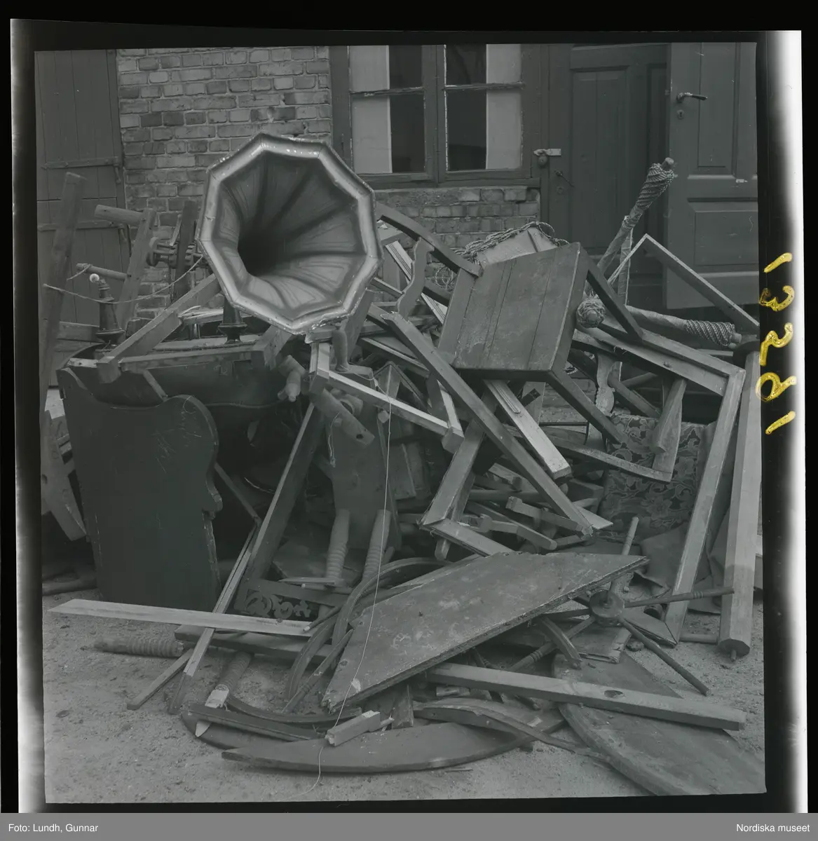 En hög med bråte, möbler och redskap. Överst tratten till en grammofon.