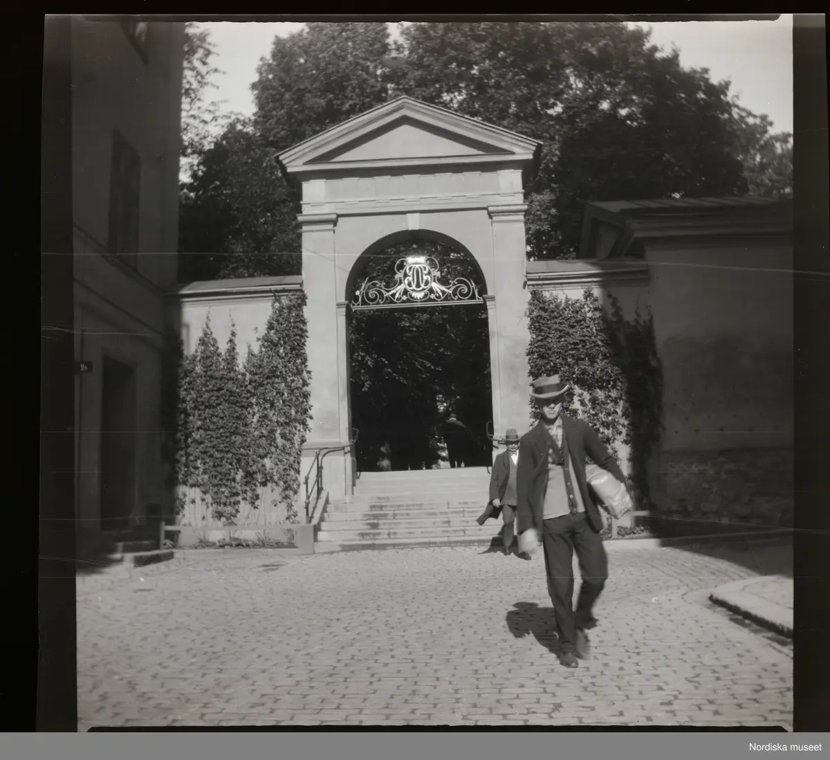 Portal till Katarina kyrkogård. Södermalm, Stockholm. En man passerar med ett paket under armen.