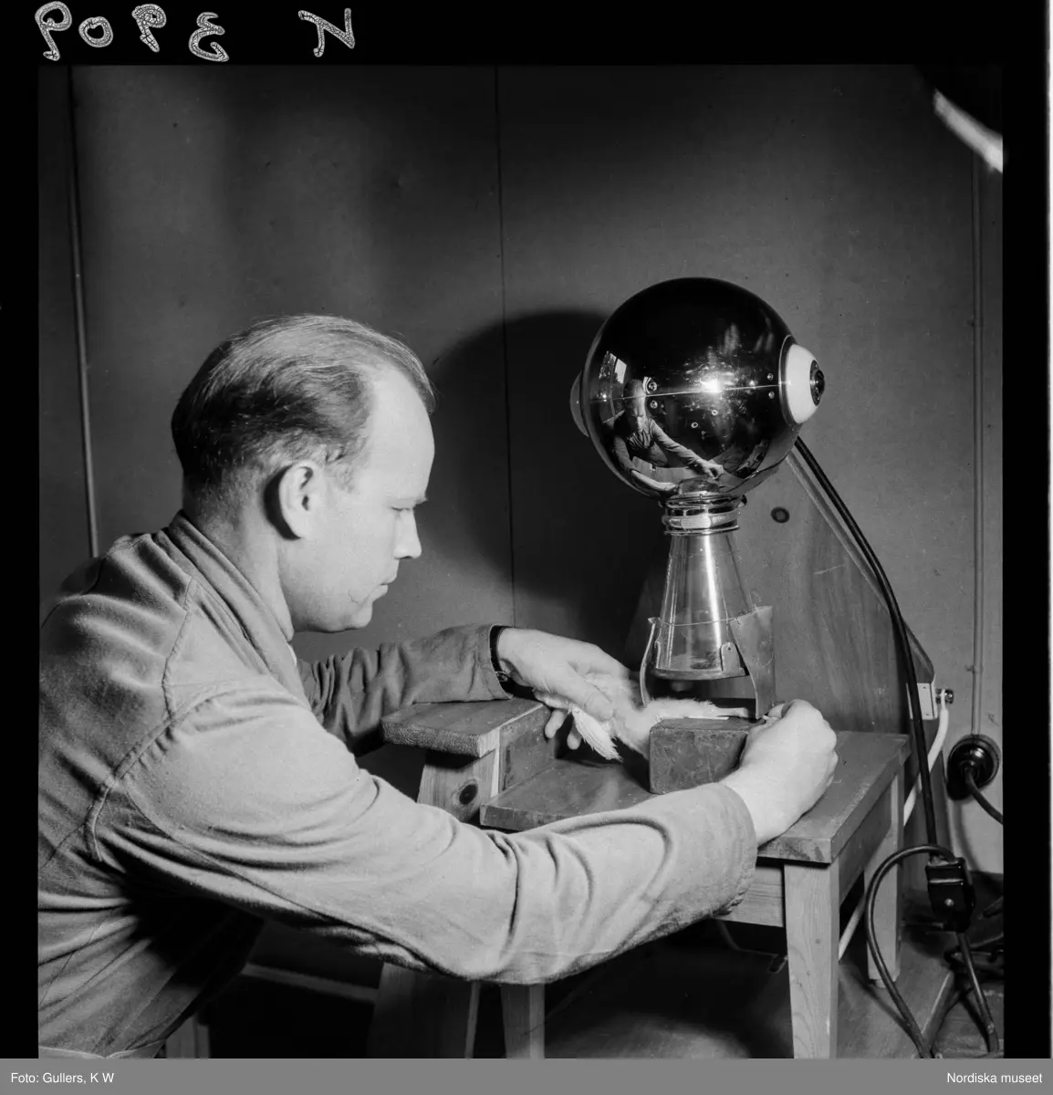 507 D Ultuna. En man studerar en kyckling i en apparat.