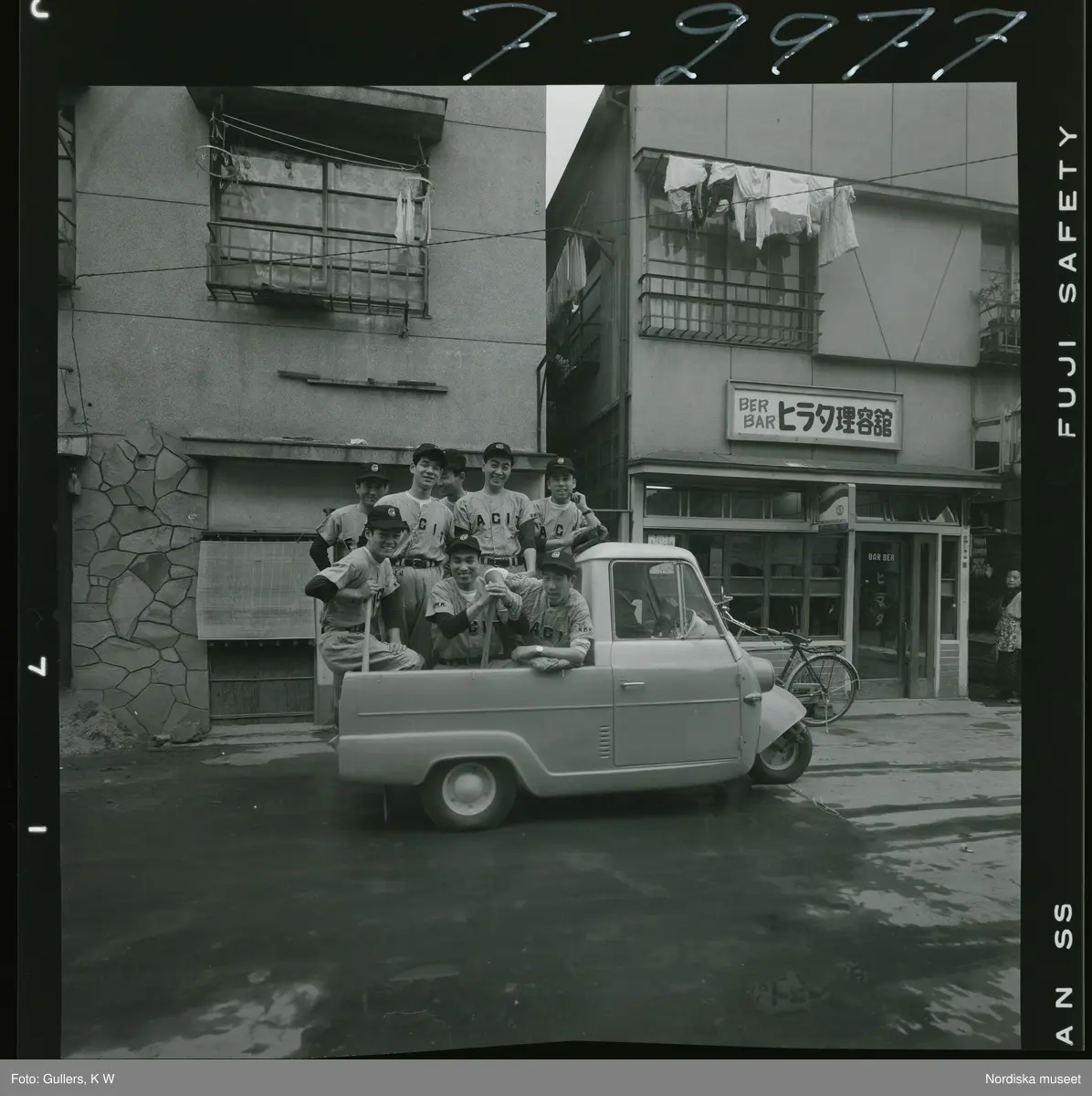 Titel: 585/8 Facit Tokyo Daberg. Facit baseboll-lag poserar på flaket av en liten trehjulig bil.