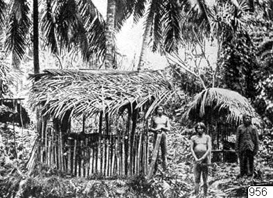 Motiv: Hyddor hos schom Pen på Stornikobarerna. Etfer E.H.Man. Stam: Schom Pen. Foto: Fotograf okänd, datum okänd. Erh: gm köp av dr W.Kaudern, 1947. Publ. Georg Buschan: Illustrierte Völkerkunde II:I. Stuttgart 1923. Abb. 485, p. 795. (katalogkort)