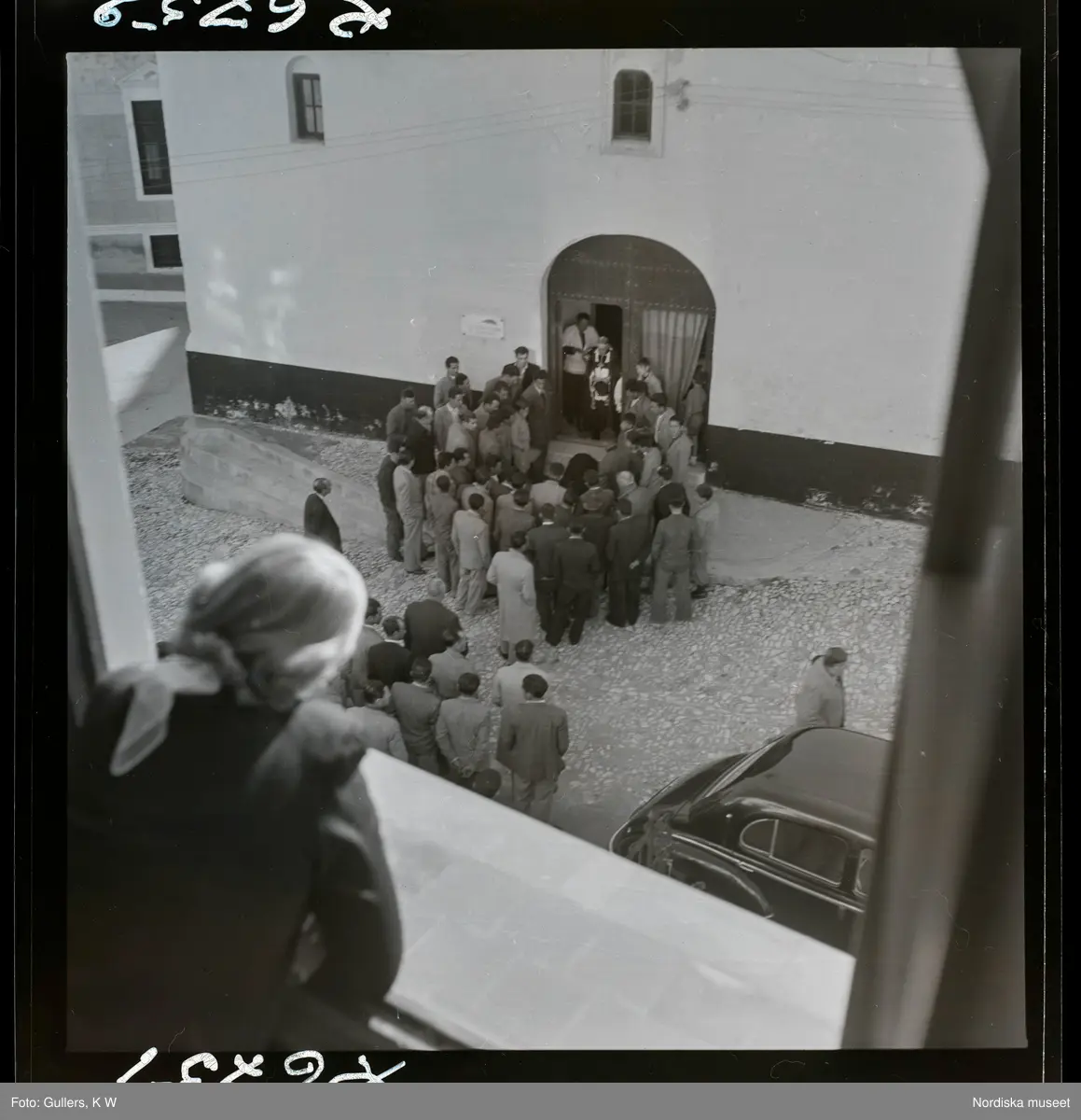 568 F. Stieg Trenter, Torremolinos. Begravning. Sörjande har samlats vid kistan framför kyrkan.En kvinna betraktar dem från ett fönster.