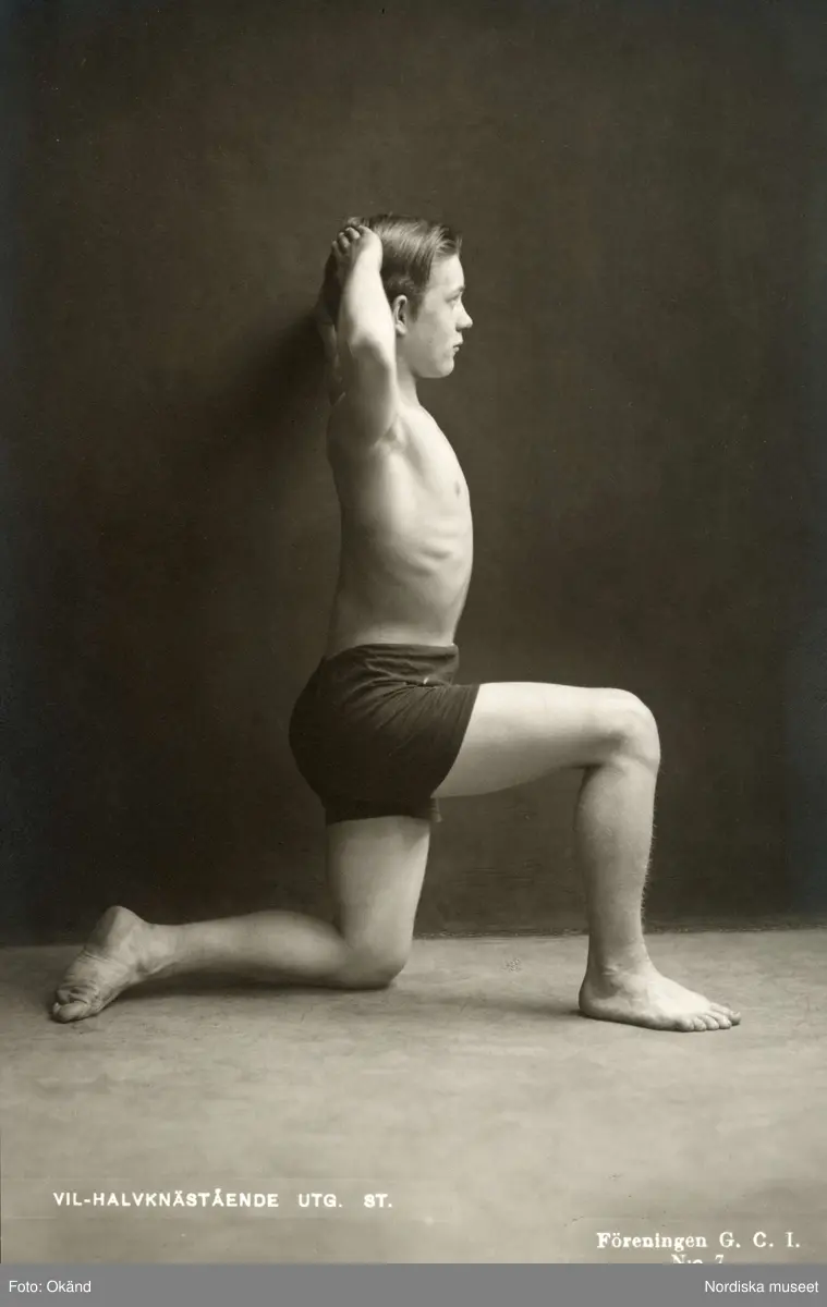 En ung man gör gymnastik: "Vil-halvknästående utgångsställning.". Vykort N:o 7 utgivet av föreningen G. C. I. / Gymnastiska Centralinstitutet