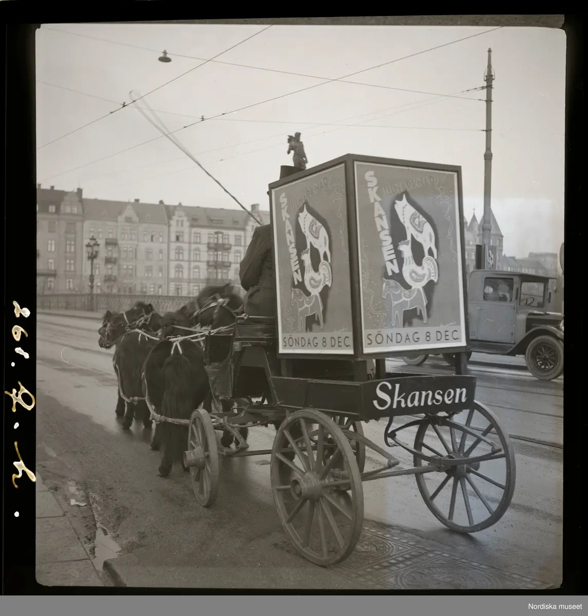 Vagn dragen av schetlandsponnys över Djurgårdsbron. Reklam för Skansen julmarknad söndag 8 dec.