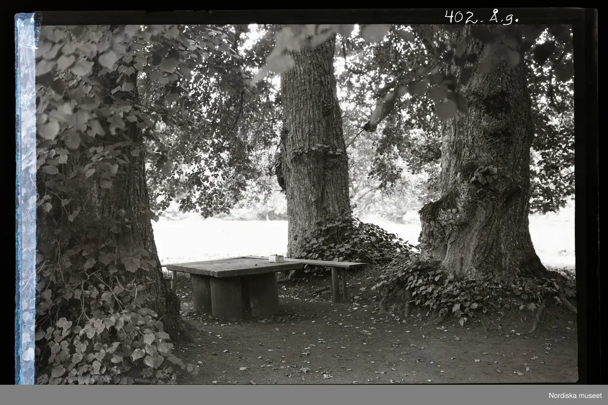 Sittplats med bord och bänk mellan stora träd i en trädgård.