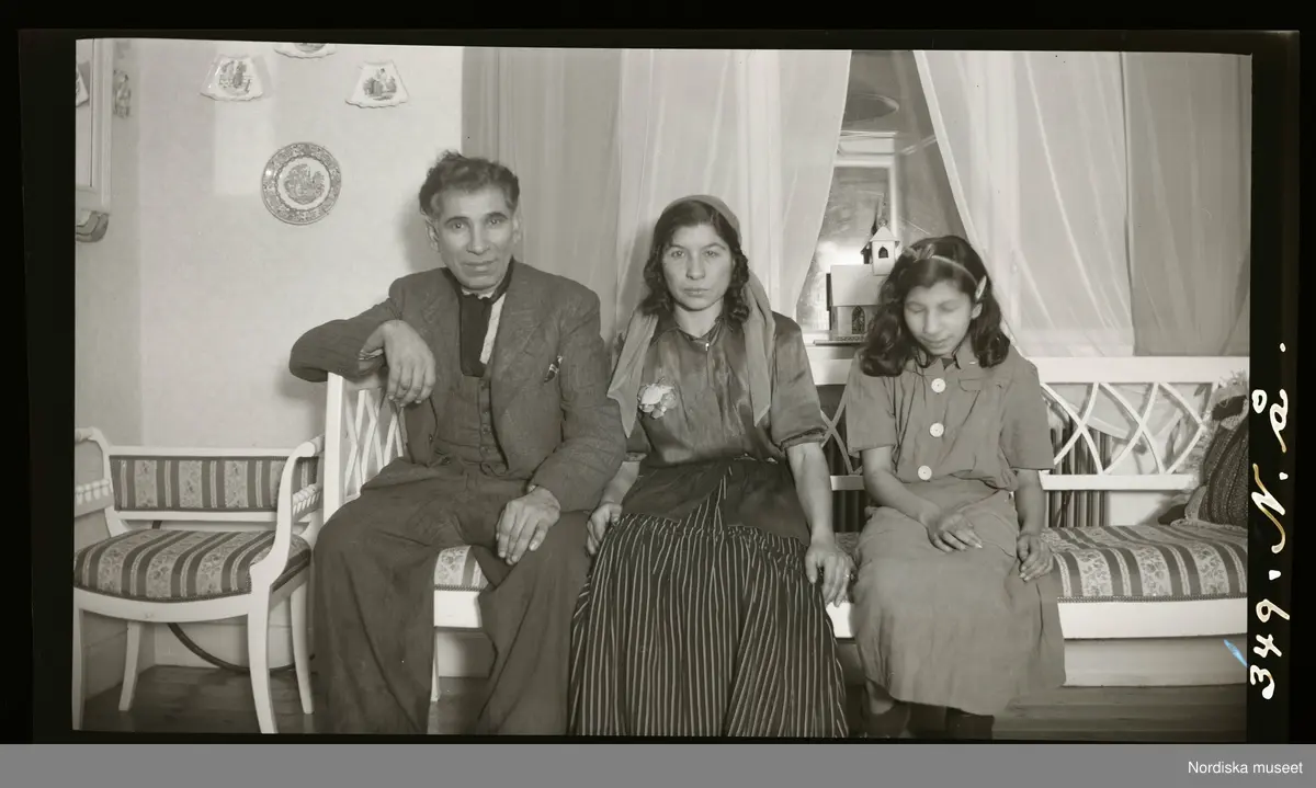 Porträtt av en man, en kvinna och en flicka sittandes i en soffa.