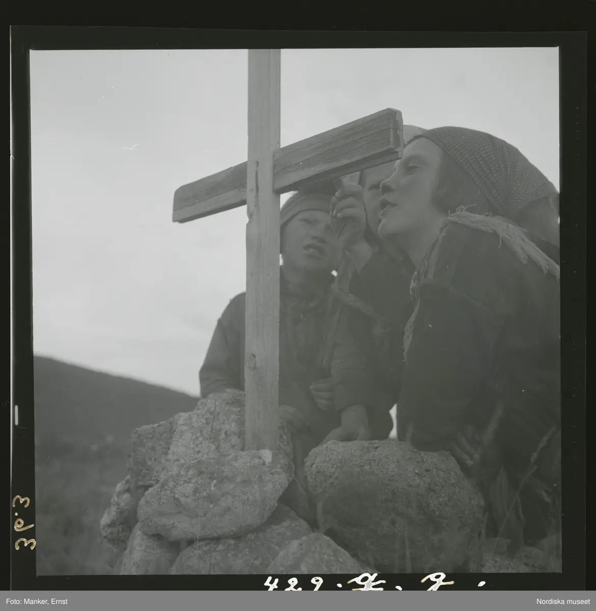 Barn läser inskription på gravkors. Vuokso, Jukkasjärvi sn.