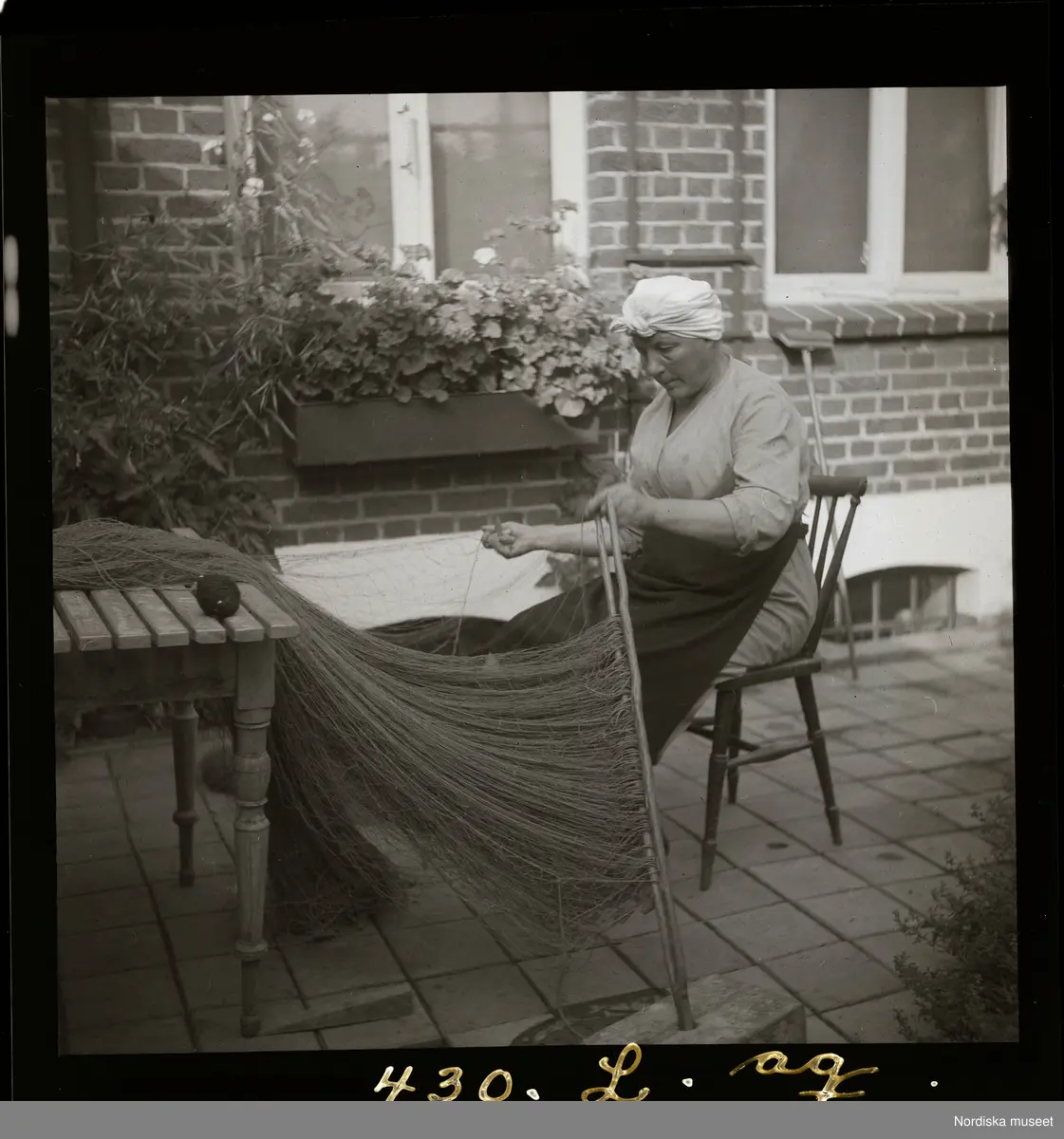 Text på montering i arkivet: Fru Louise Nilsson "bödar" garn. Träklykan garnen äro uppträdda på är den s.k. "klåven".