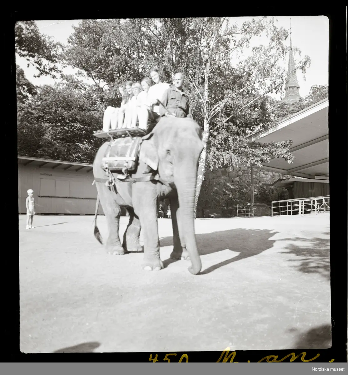 Elefanten på Skansen gör en tur med besökare på ryggen. Skansen, Stockholm.