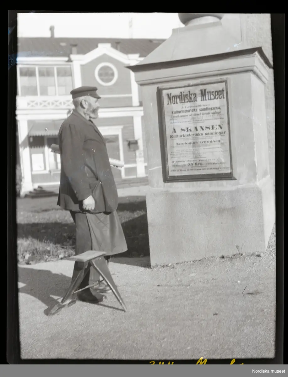 Man framför en affisch som gör reklam för Nordiska museet och Skansen. Djurgården, Stockholm.
