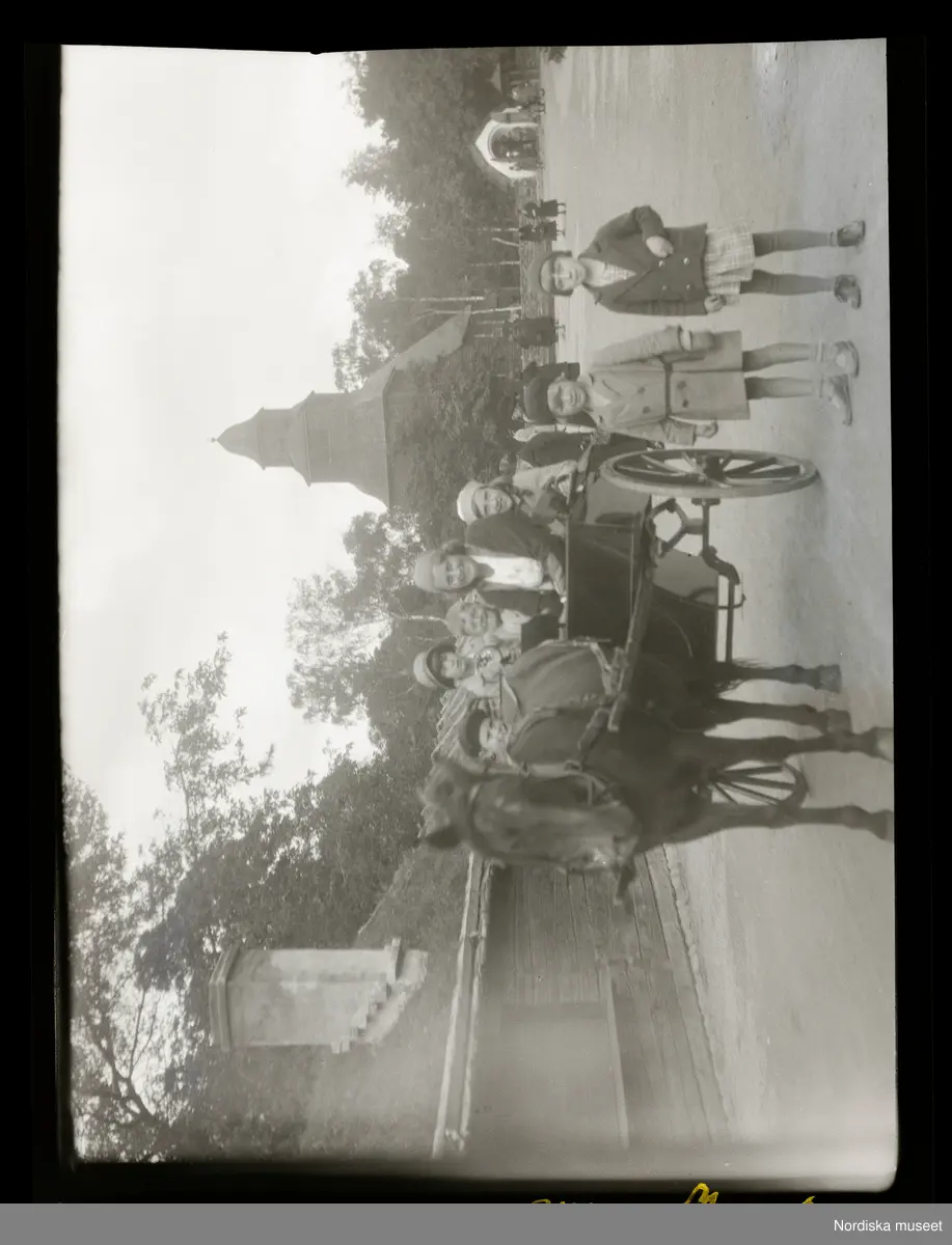 Barn i en vagn dragen av häst. Skansen, Stockholm.