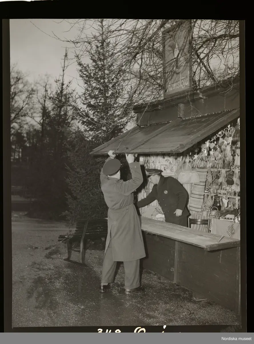 Två män öppnar upp ett marknadsstånd med hemslöjd. Skansen, Stockholm.