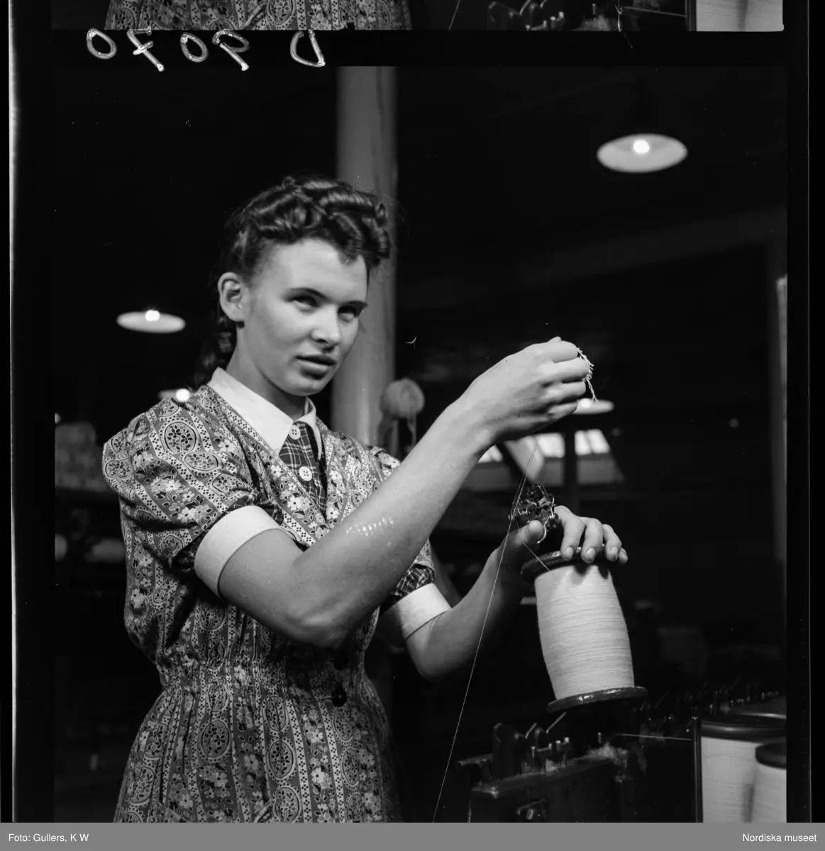 Kvinnlig arbetare med en stor rulle sytråd, i tekoindustrin på Borås Wäfveri.