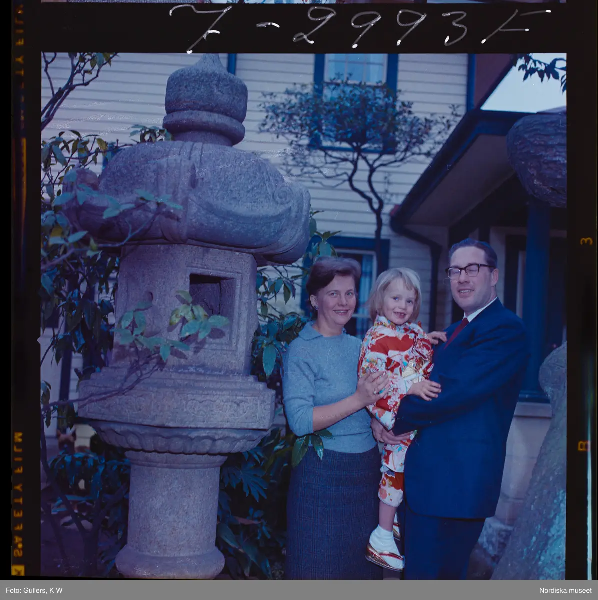 585/8 Facit Tokyo Daberg. En familj står i en trädgård vid en japansk lykta av sten. Barnet är klädd i kimono.