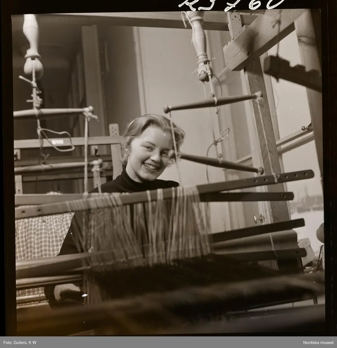 1677 A Fröken Pia Jonsson, Konstfackskolan Stockholm. Porträtt av en elev som väver.
