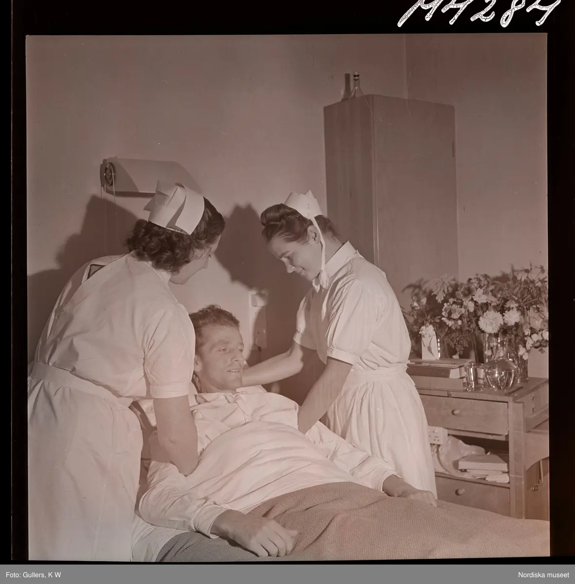 1714 En sjuksköterskas arbetsdag på södersjukhuset. Ett par sköterskor hjälper en patient i en sjukhussäng.