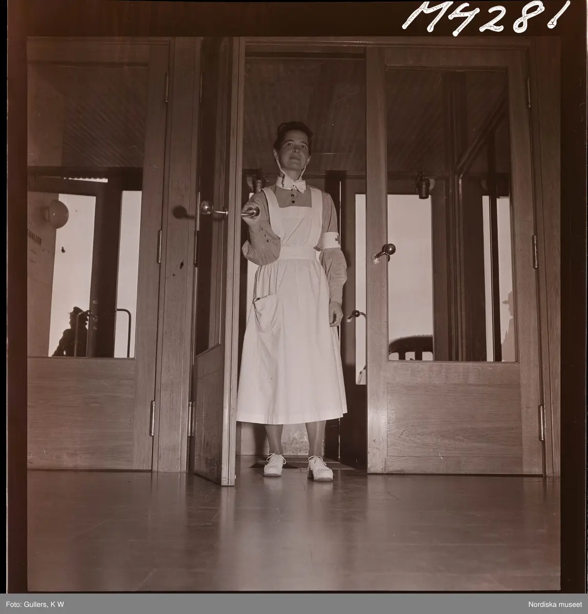 1714 En sjuksköterskas arbetsdag på södersjukhuset. En sköterska står i en entrédörr.