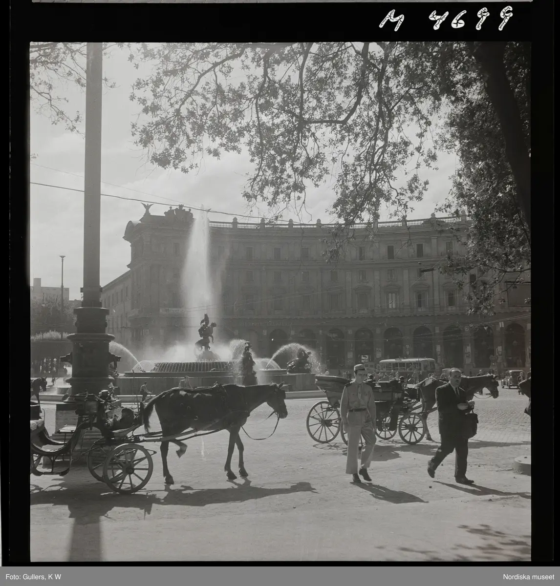 1717/B Rom. Gatuliv. Hästar med vagnar på ett torg med fontän.