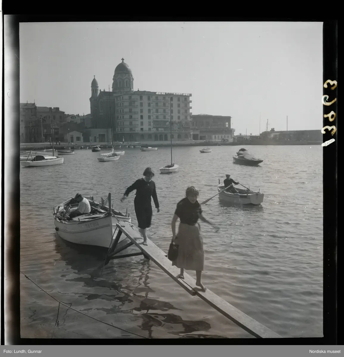 Två kvinnor landstiger från en båt. I bakgrunden kyrkan Notre Dame de la Victoire. Saint-Raphaël, Franska rivieran.