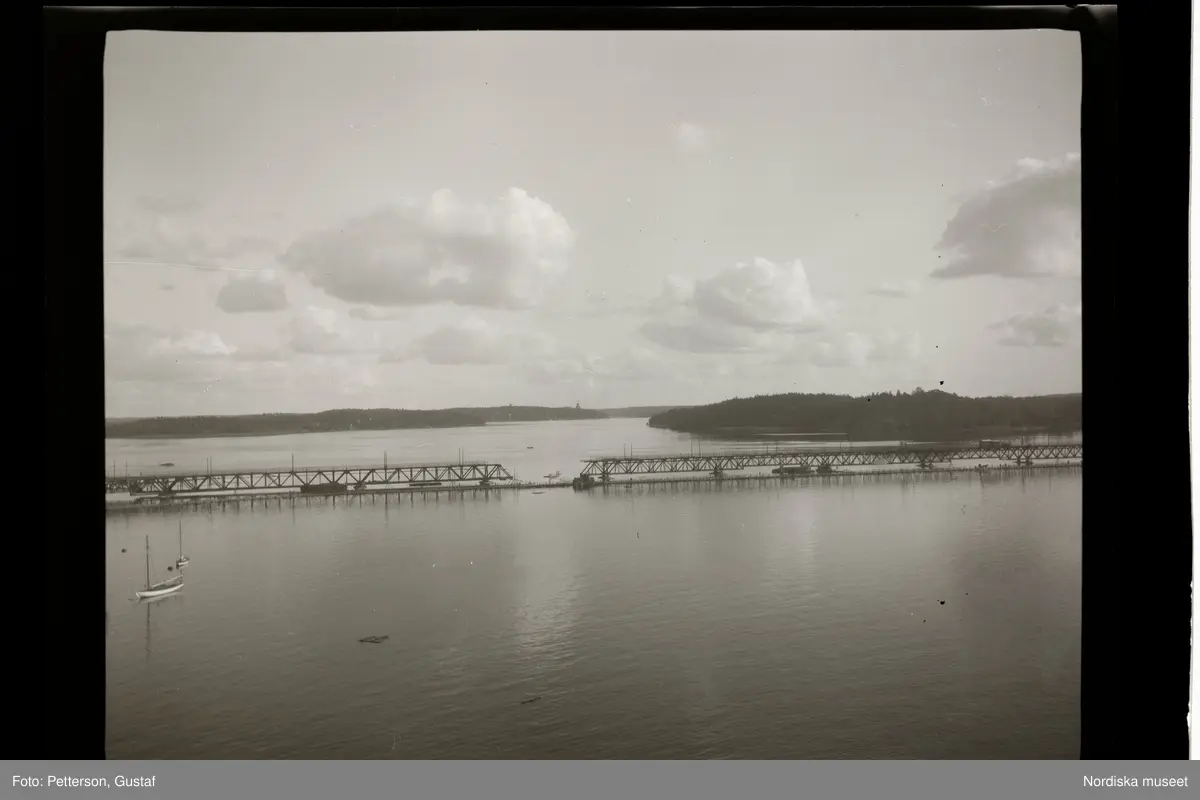 Lidingöbron under byggnation. Vy västerut mot Tranholmen och Stocksund.