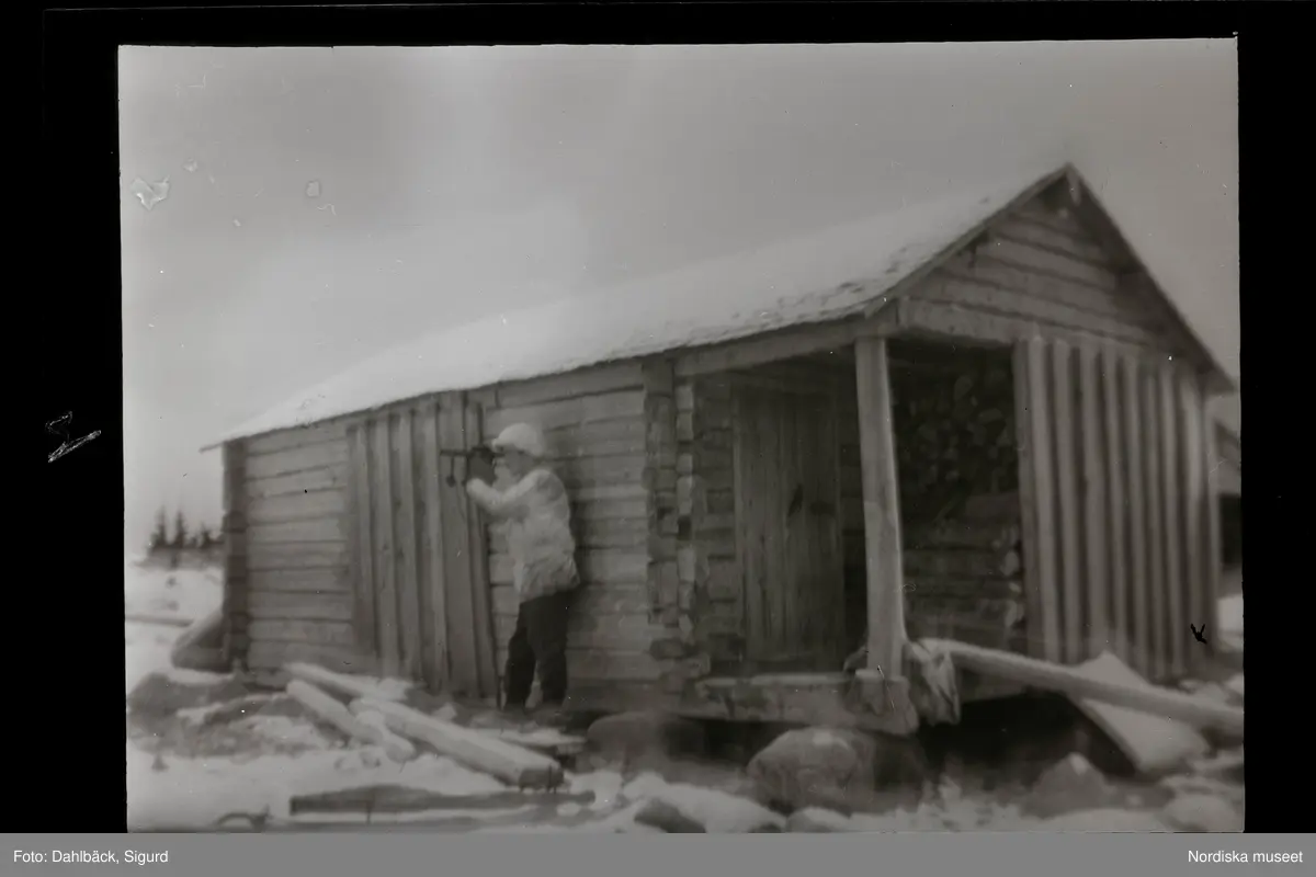 Fotografens anteckning: Byviken, stuga 3 söderifrån räknadt + Drängen Gottfrid P. (Pettersson) i säljaktsdrägt.
