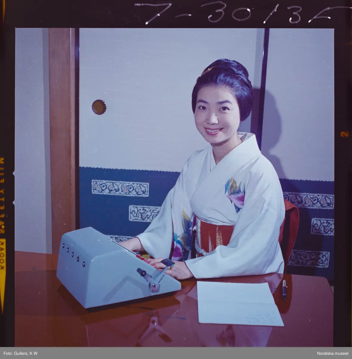 Titel: 585/8 Facit Tokyo Daberg. Porträtt av en kvinna i kimono som arbetar vid en Facit maskin.