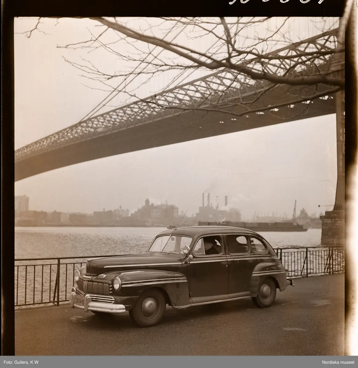 1690 New York allmänt (N.Y. Herald Tribune). George Washington bridge. En bil passerar under bron.