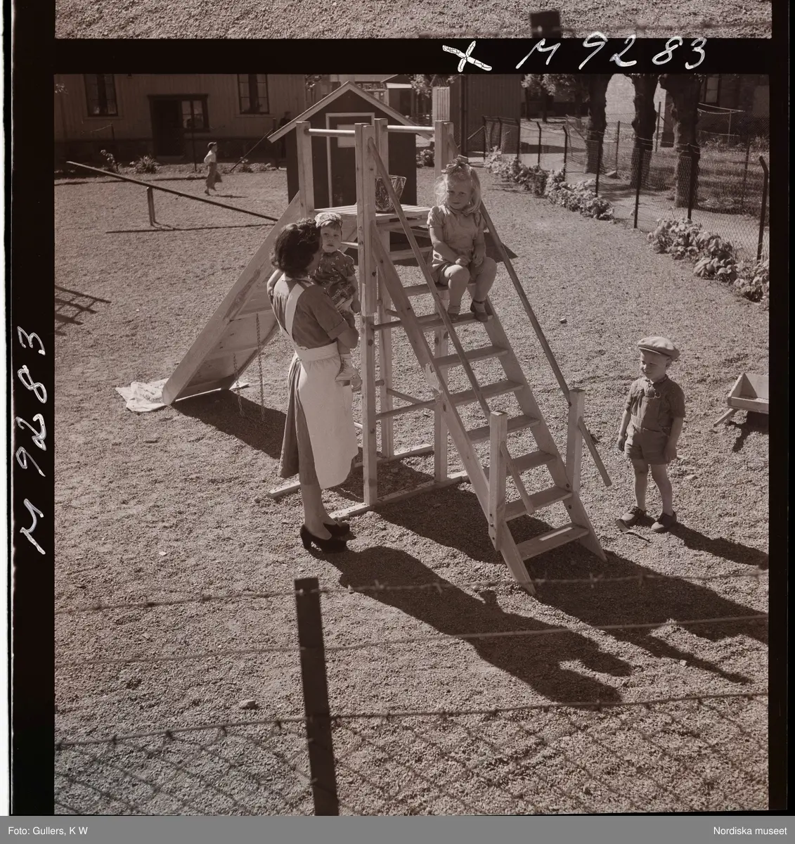 1708 G Mölnlycke väverier, Mölnlycke. Barn och en barnskötare vid rutschkanan på en lekplats.