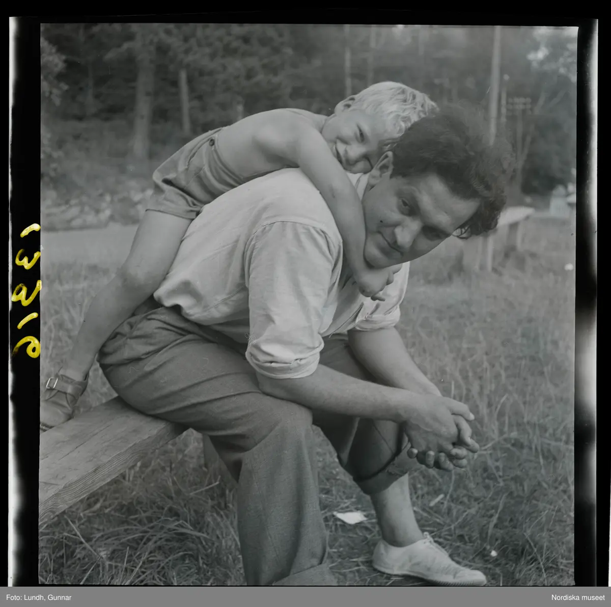 En liten pojke hänger över ryggen på konstnären Bertil Wahlberg som sitter på en bänk ute på en gräsmatta.