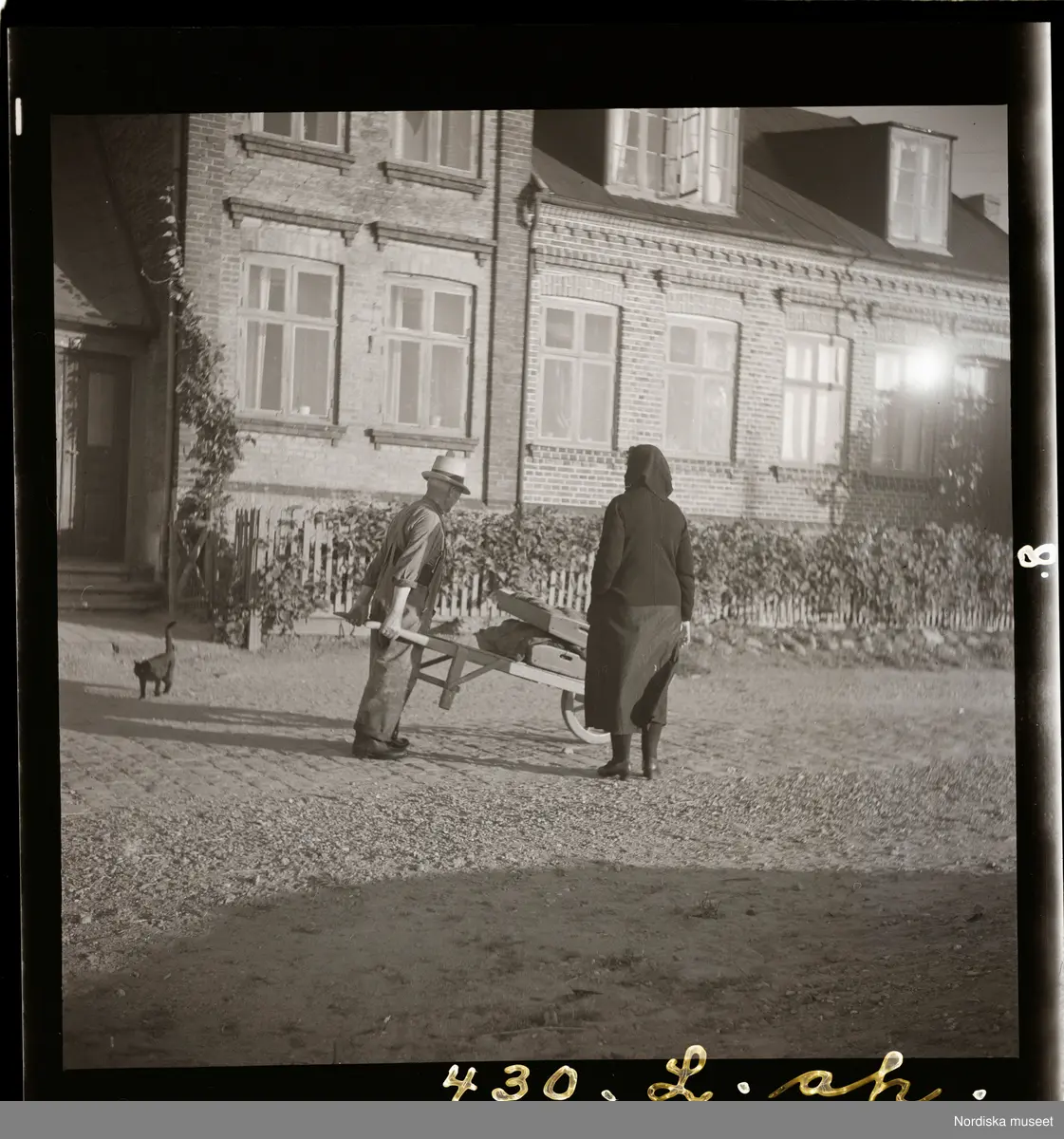 Text på montering i arkivet: Fiskare Mårtensson med "rullebör" (skottkärra) och fru Alma Pålsson. I bakgrunden Kajgatan 3-5.