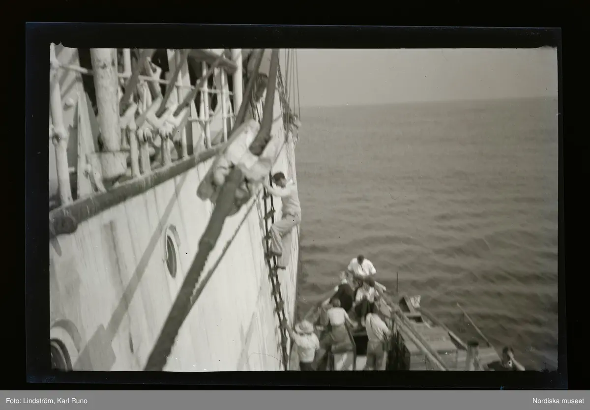 En man klättrar i en repstege från ett fartyg till en båt nedanför.