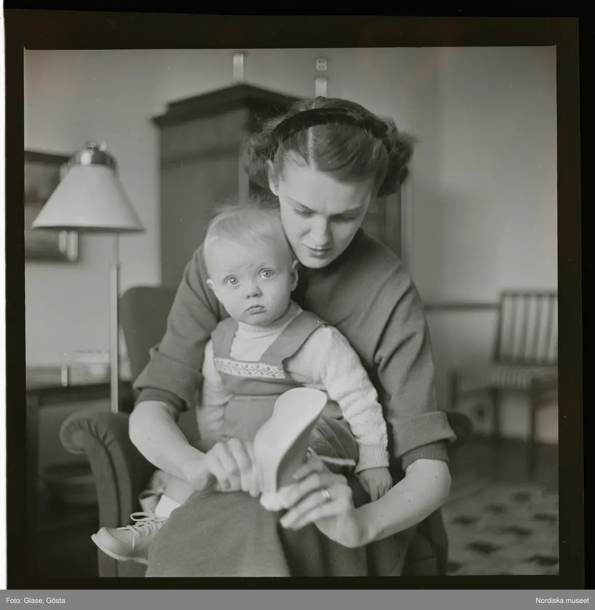 En kvinna sätter skor på ett litet barn som sitter i hennes knä.