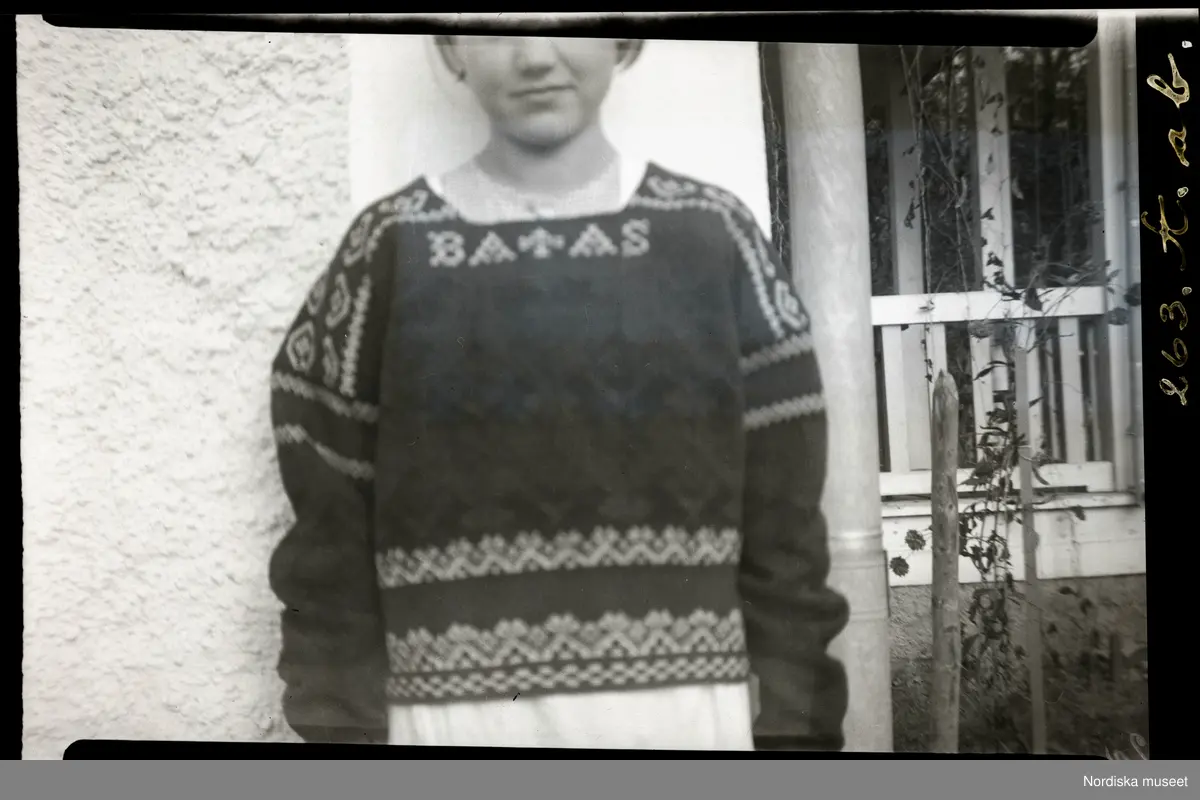 Flicka i stickad tröja med mönster, vid halsringningen bokstäverna "BA (T?) AS".