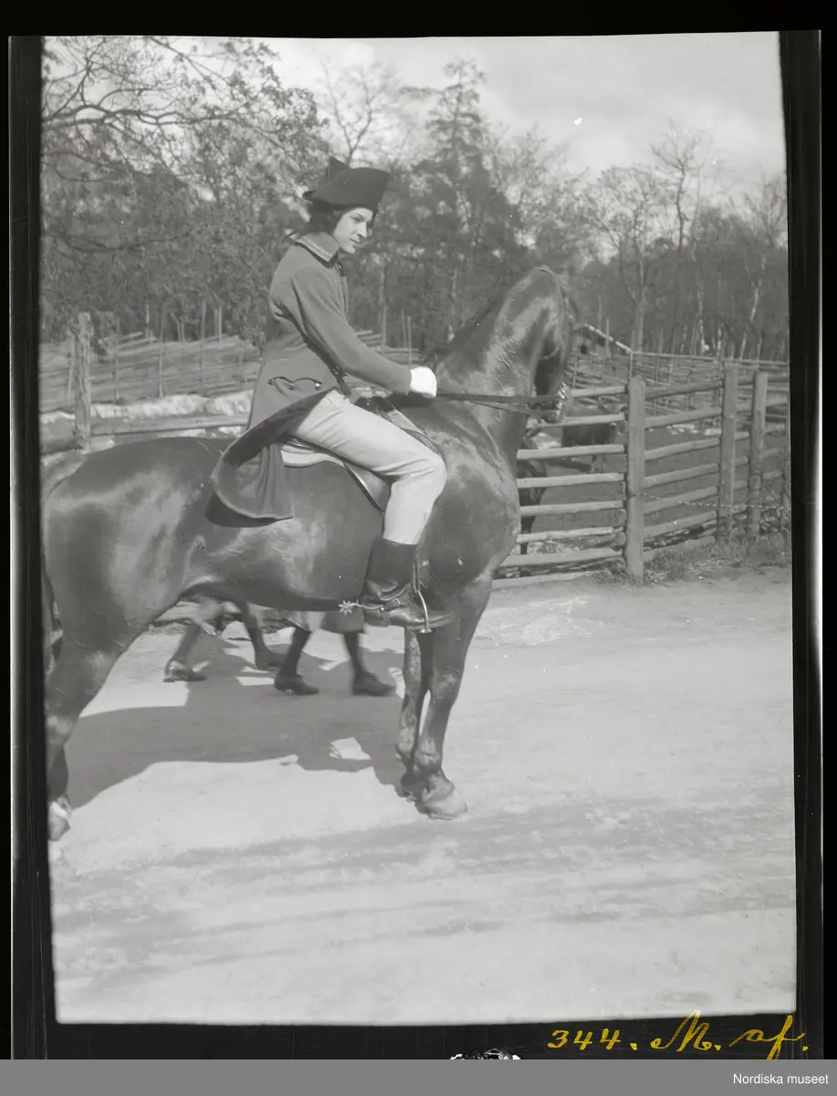 Man i äldre uniform, till häst. Skansen, Stockholm.